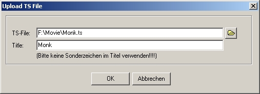Wählen Sie dazu eine TS-Datei auf dem PC aus und vergeben einen Titel, der dann in der Aufnahmeliste angezeigt werden soll. Der Dateiname wird dabei immer vorgegeben. Der Uploadvorganf entspricht der Beschreibung im Abschnitt Commander/Kopieren...